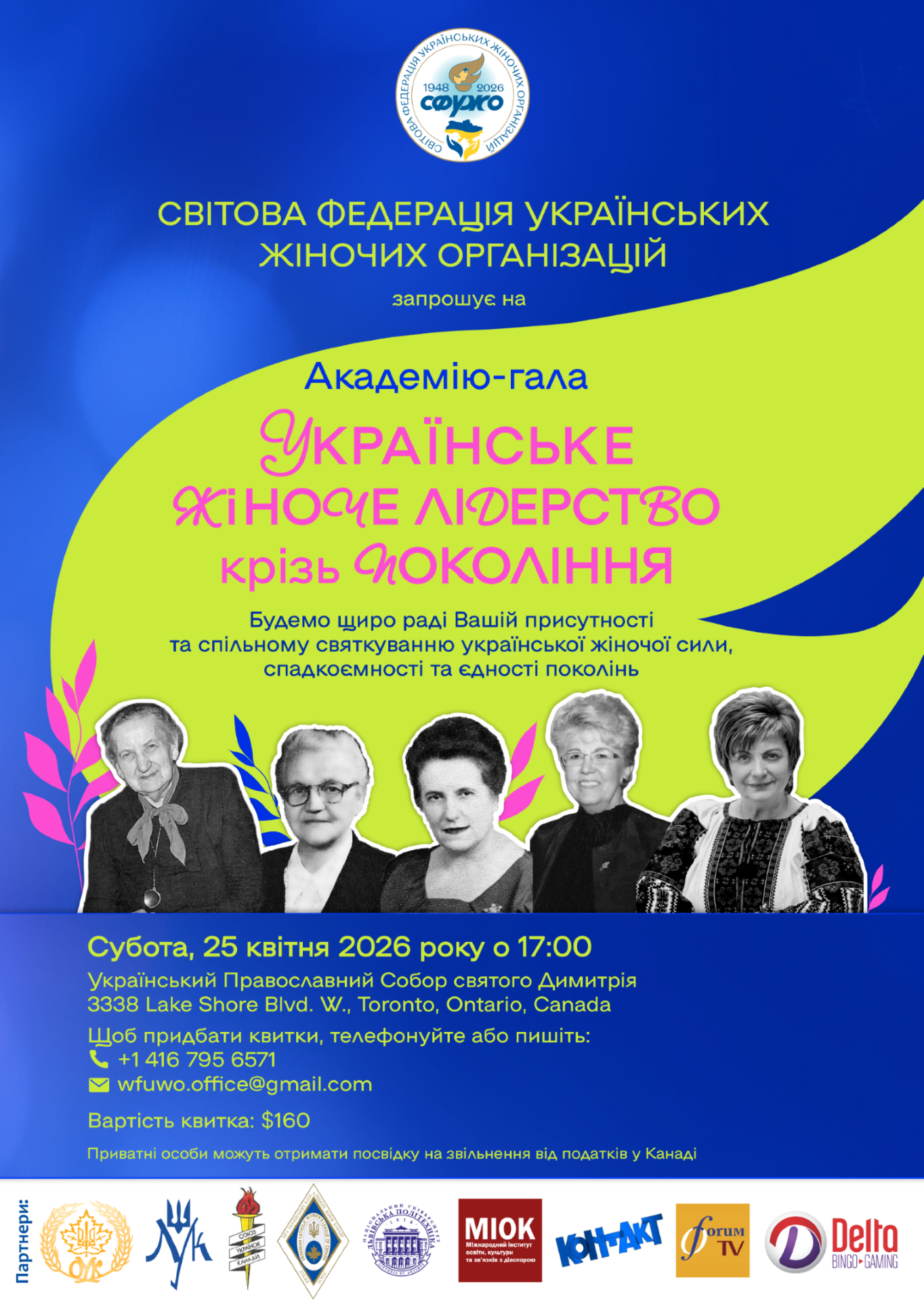 Захід відбувається у партнерстві з українськими жіночими організаціями Канади – Організацією Українок Канади імені Ольги Басараб, Ліґою Українок Канади, Ліґою Українських Католицьких Жінок Канади, Союзом Українок Канади, а також Міжнародним інститутом освіти, культури та зв'язків з діаспорою Національного університету «Львівська політехніка», канадськими медіаплатформ Forum TV і Kontakt Ukrainian TV та за підтримки Delta Bingo Gaming.