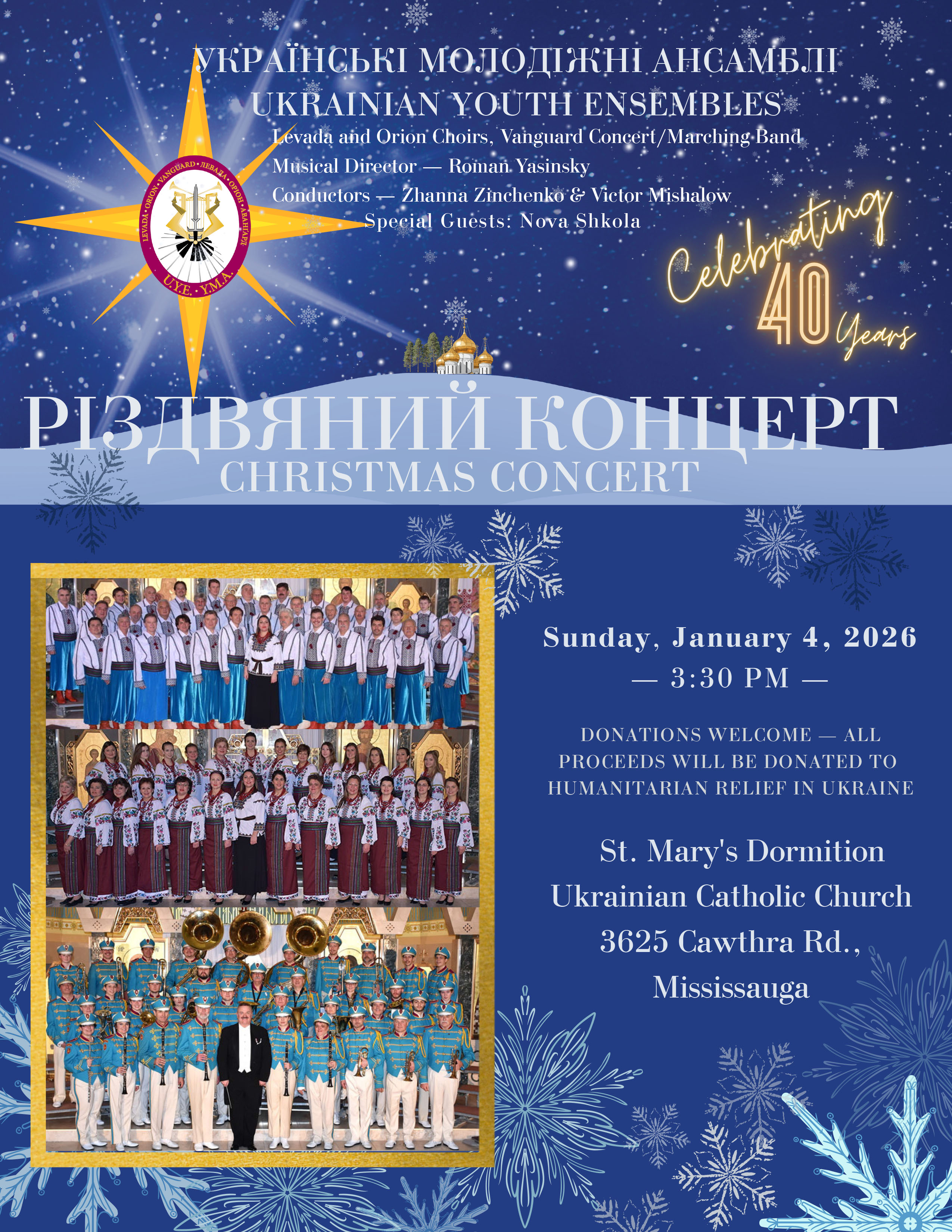 The Ukrainian Youth Ensembles, consisting of the Levada Women's Choir, the Orion Men's Choir , Levada and Orion Mixed Chorus, and the Vanguard Concert/Marching Band, under the musical direction of Roman Yasinsky and conductor Zhanna Zinchenko, Victor Mishalow, will be presenting a Christmas Concert on Sunday, January 04, 2026 (3:30 p.m.), at St. Mary's Dormition Ukrainian Catholic Church, 3625 Cawthra Road in Mississauga. Special guests’ “Nova Shkola”.