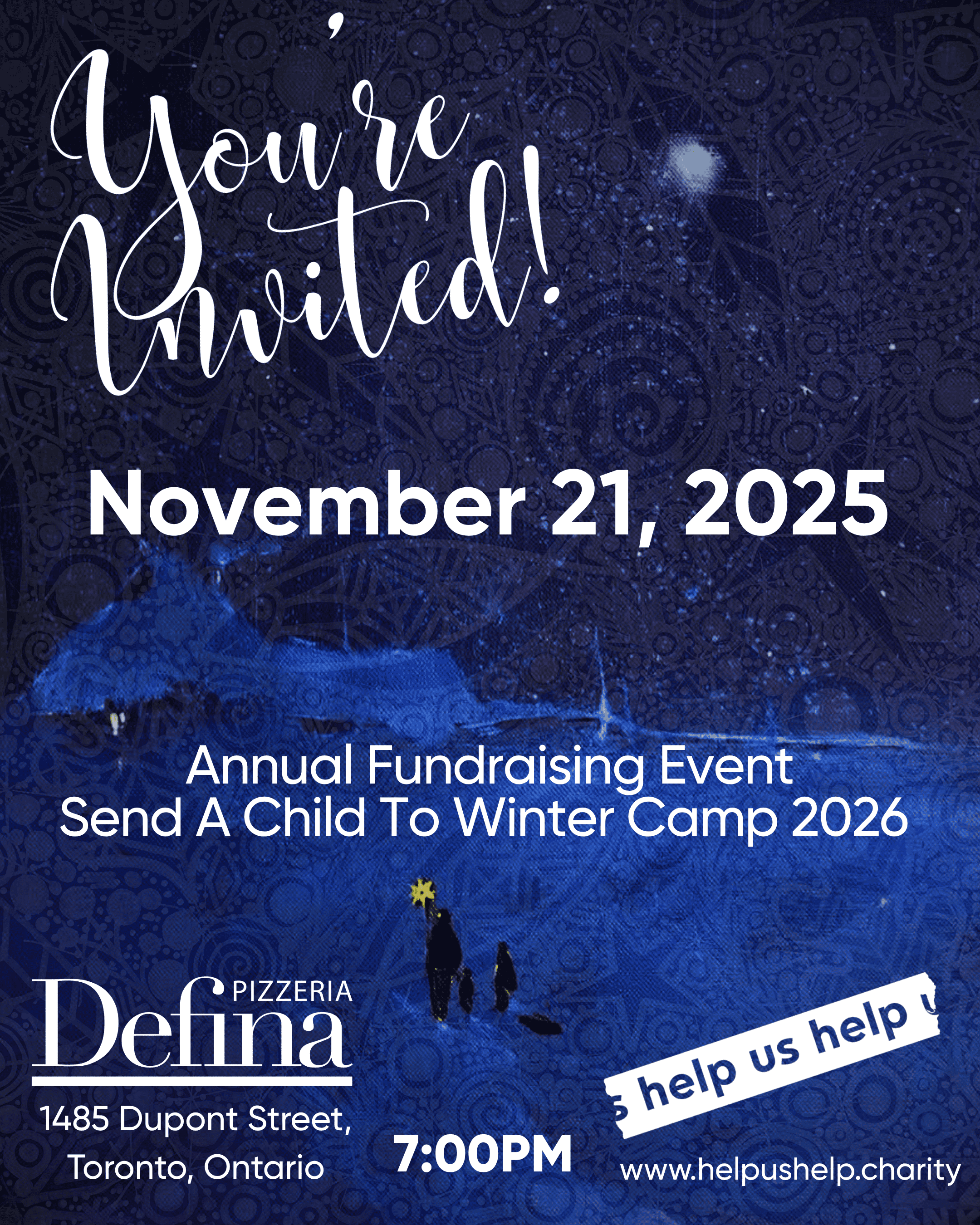 Help Us Help is proud to host our annual Send a Child to Winter Camp fundraising event on Friday, November 21, 2025, at Defina Woodfired (1485 Dupont Street, Toronto), from 7:00pm onwards.