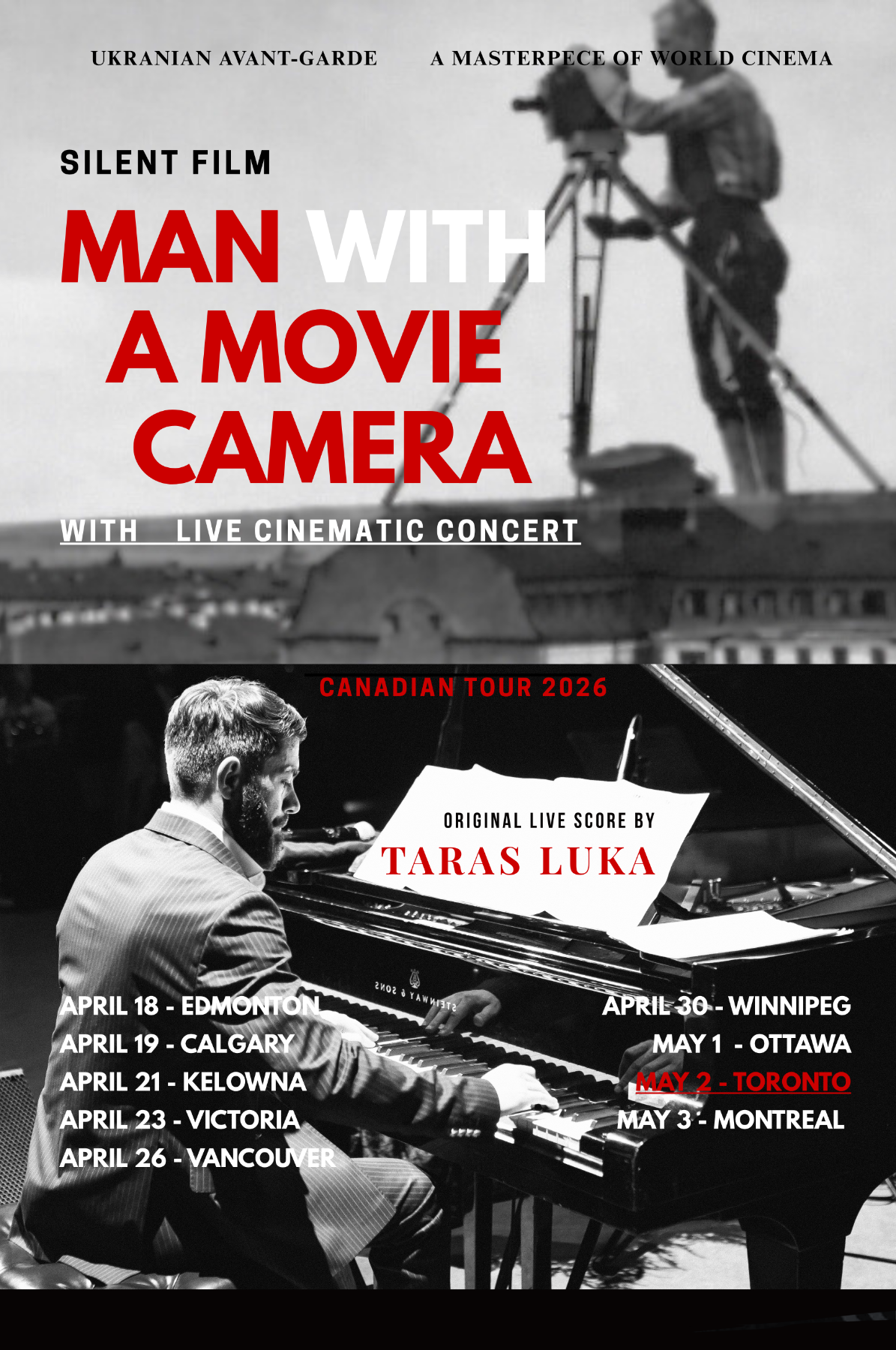 Ukrainian-Canadian composer and pianist Taras Luka performs an original piano score LIVE to the iconic Ukrainian avant-garde film Man with a Movie Camera (Dziga Vertov, 1929). It'll be the first in a series of exclusive and immersive live soundtrack experiences happening this summer at the St Volodymyr Institute's new underground speak-easy lounge INSTITUT (620 Spadina Ave.)The film was produced in Ukraine by All-Ukrainian Photo Cinema Administration (VUFKU) and filmed in Kyiv, Odesa, and Kharkiv, capturing the rhythm of modern city life through groundbreaking cinematic techniques.In the Sight & Sound critics’ poll, it was ranked among the top ten greatest films of all time and later named the greatest documentary film ever made.Created without actors, costumes, sets, or a traditional script, the film captures a single day in the life of a modern city. Vertov documents urban life through pure cinematic form, transforming everyday reality into a dynamic visual symphony through radical editing, rhythmic montage, and bold visual experimentation.During the screening, Luka performs the score live on stage, transforming the film into a powerful immersive audiovisual experience where music and image unfold together in real time.***Taras Luka is an award-winning composer with an international career across Europe and North America, known for his work in theatre, film, and large-scale concert productions. His work “Choral of Freedom” world premiered at Teatro Comunale di Bologna and Teatro Verdi (Italy) under conductor Oksana Lyniv as part of the international Concerto per la Pace initiative with the Italian Red Cross.Taras is the composer of major theatrical and musical productions, including Romeo & Juliet, Heart in Half, Buka, and In Captivity. His works have received national recognition in Ukraine