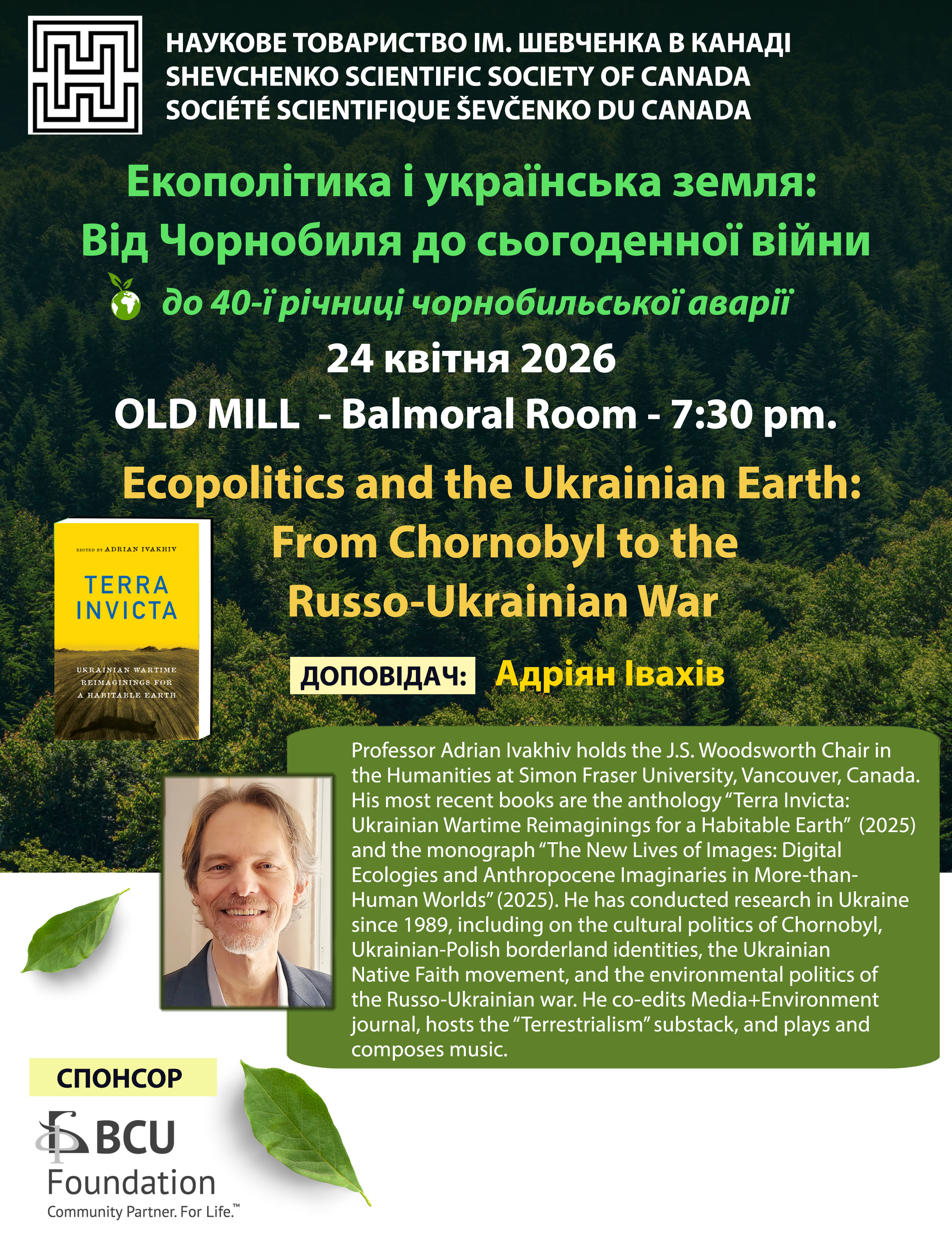Адріян Івахів є завідувач кафедри Simon Fraser University у Ванкувері. Його дві останні книжки - "Terra Invicta: Ukrainian Wartime Reimagining for a Habetable Earth" (2025) і " The Lives of Images : Digital Ecologies and Anthropocenene Imaginariesvin More-than-Human Worlds" (2025). Проф. Івахів спеціалізується в питаннях довкілля і культури. Він проводить дослідження в Україні від 1989 року, включаючи культурну політику Чорнобиля, українсько-польські ідентичності пограниччя, і політику навколишнього середовища російсько-української війни. Його доповідь 24 квітня присвячена 40-ій річниці Чорнобильської аварії.