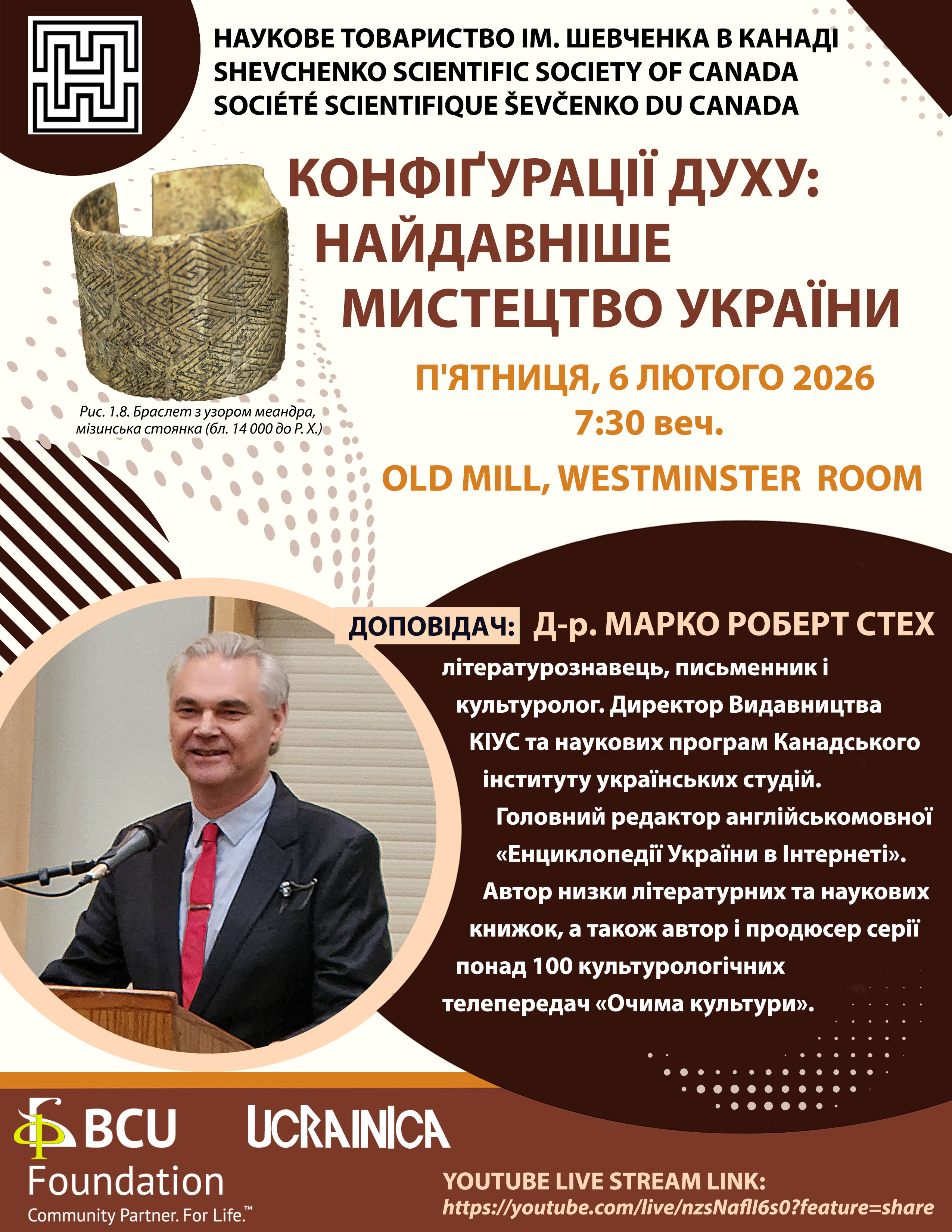 Д-р Марко Роберт Стех - літературознавець, видавець, письменник, автор книжок та статей з різноманітних тем української літератури та культури, автор та ведучий більше сотні телепрограм "Очима культури" в телевізійній програмі "Контакт". Останнім часом д-р Стех працює над фундаментальною Історією української культури. Перші розділи цієї праці присвячені найдавнішим мистецьким артефактам, знайдених в археологічних розкопках на території сучасної України. Саме їм д-р Стех присвячує свою доповідь, яку представить членам та прихильникам НТШ 6 лютого 2026 року.
